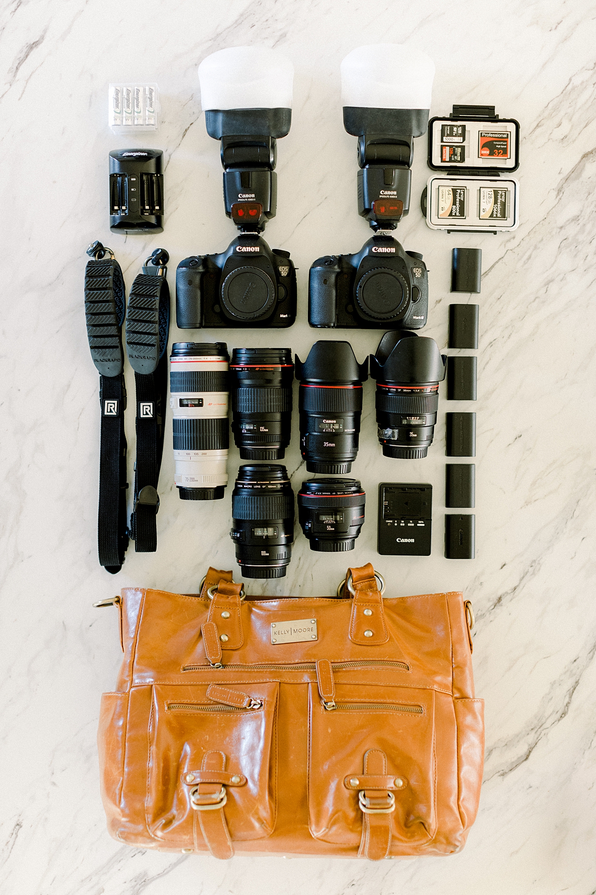 Pictured above is the entirety of my bodies and lenses that I have with me on a wedding day. Just two years ago though I only had half of these and did just fine! Before expanding my collection to fit different needs, all I had was the 35mm, 50mm, 135mm and one Canon 5D Mark III. Aside from flashes, batteries and camera straps that we’ll talk about soon, those really served the purpose of all I needed for a wedding day! And for 6 years of business none-the-less! One common misconception that I hear a lot from photographers is that they have to get better equipment to be a better photographer and I just don’t think that’s true at all… which should be SUCH a relief because this stuff is EXPENSIVE! Get the main items you need to do a good job and then focus on educating yourself on how to use those well. Then and only then would I recommend continuing to invest in more lenses and bodies.