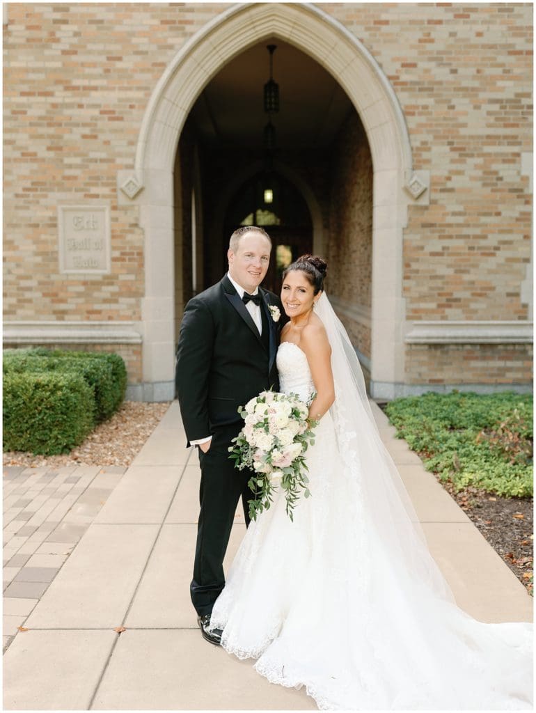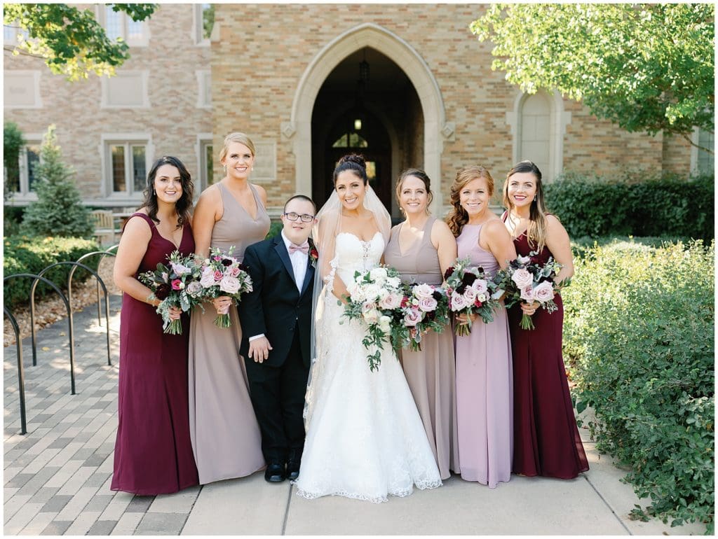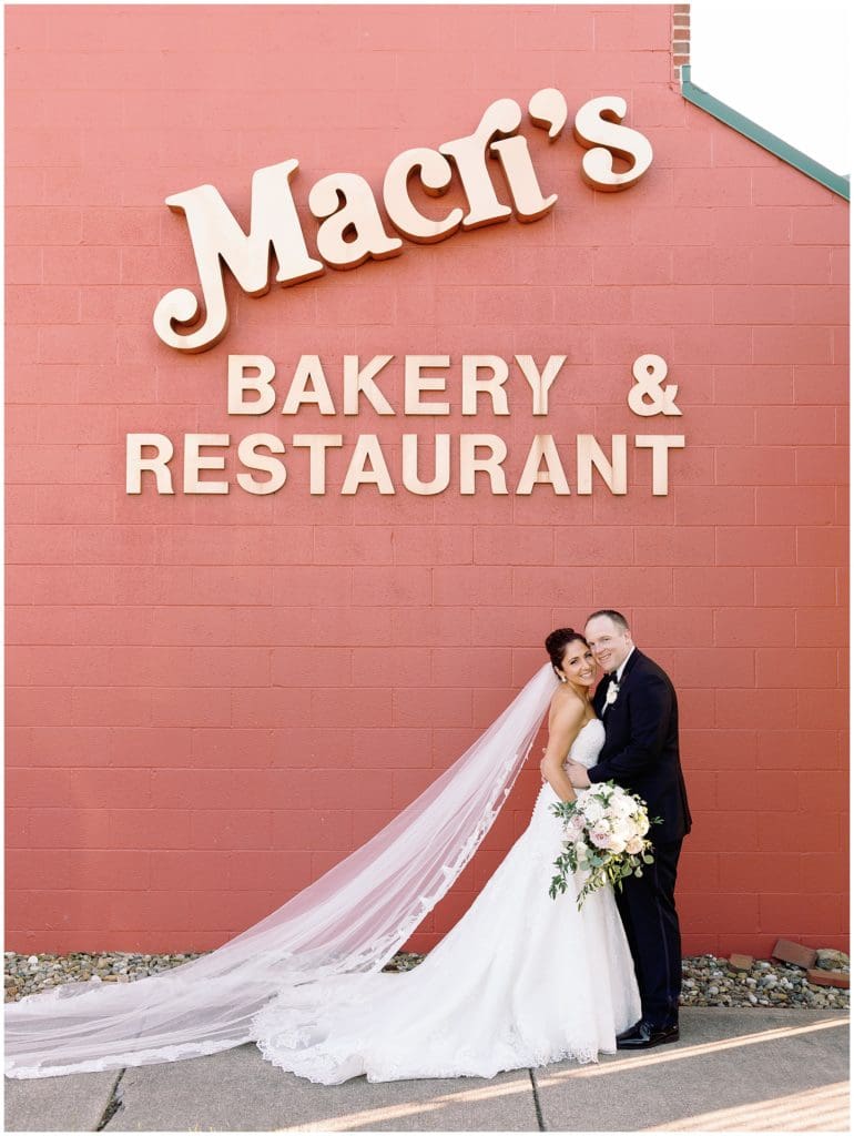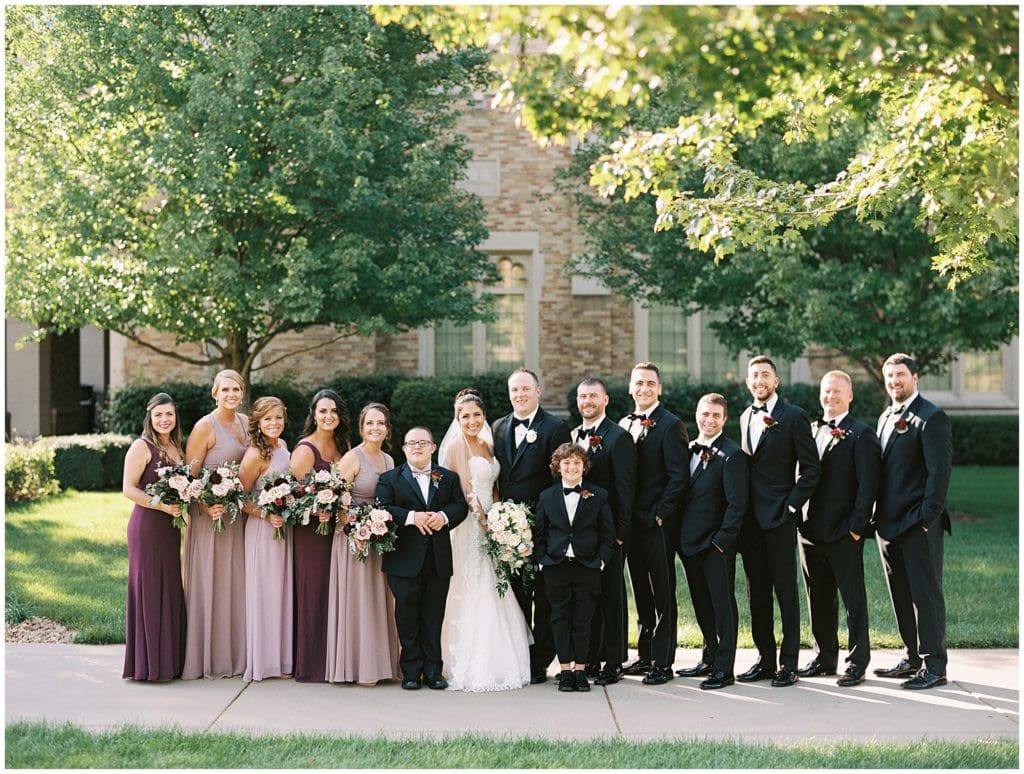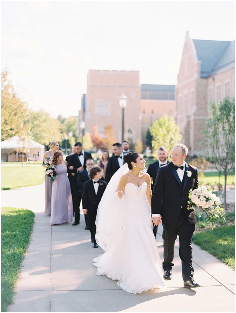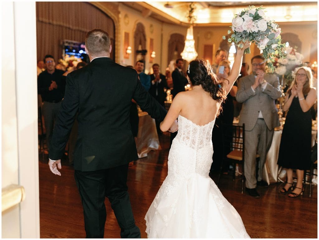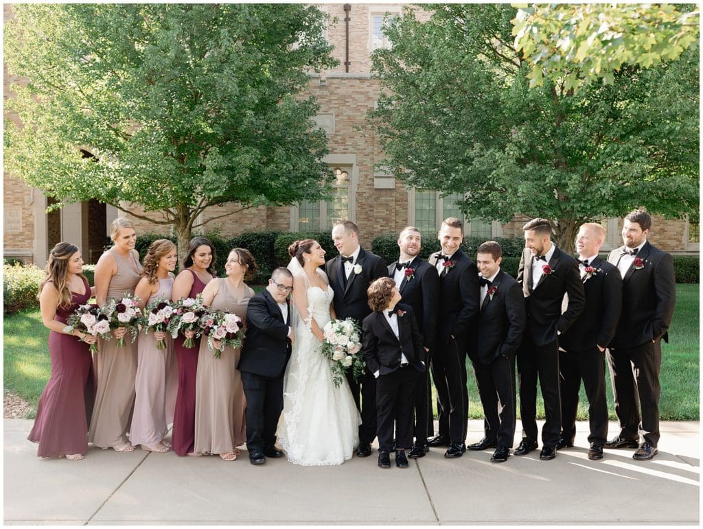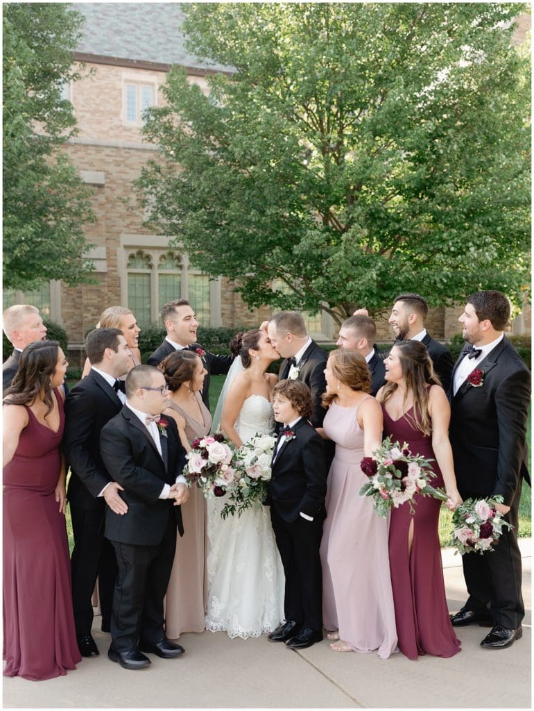 We then headed over to the campus of University of Notre Dame for some bridal party photos amongst the beautiful scenery of the campus! After some photo time there, we headed over to their family-owned restaurant, Macri’s Italian Bakery, to capture some fun shots at a place that holds a super special place in all of their hearts! Finally it was off to the majestic, Palais Royal in downtown South Bend, Indiana where the space was transformed by Poppies, AAYS and Events by ProShow with beautiful florals, rentals and additional hanging chandeliers to elevate the space. And what a celebration it held that night!