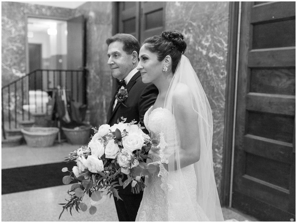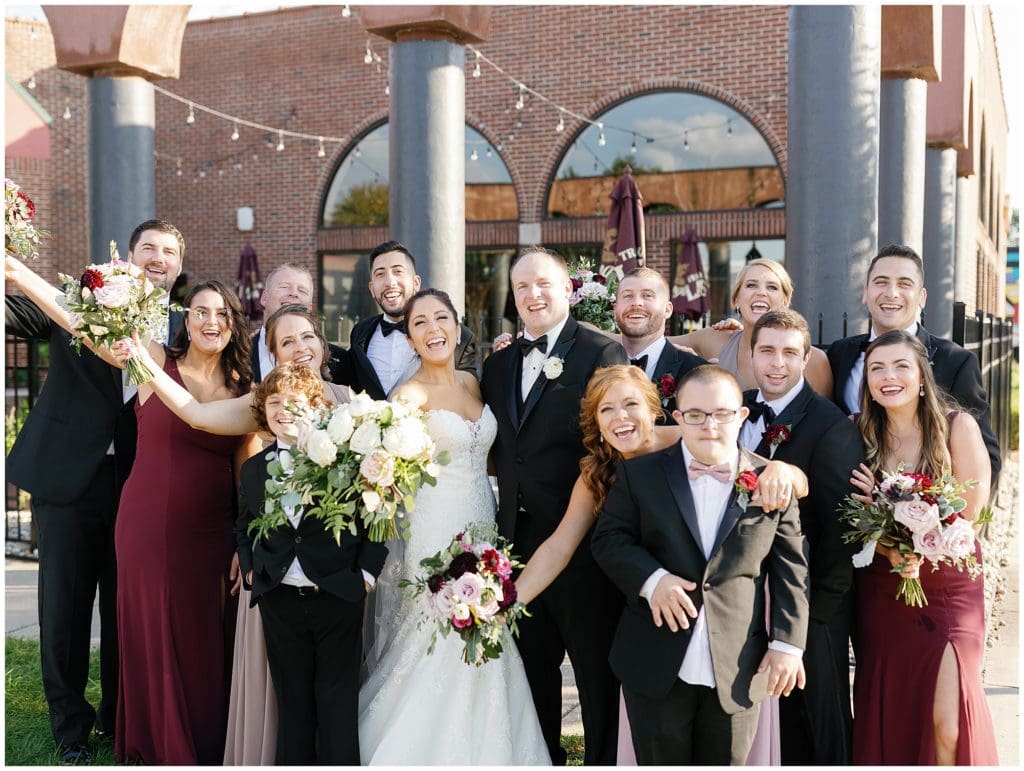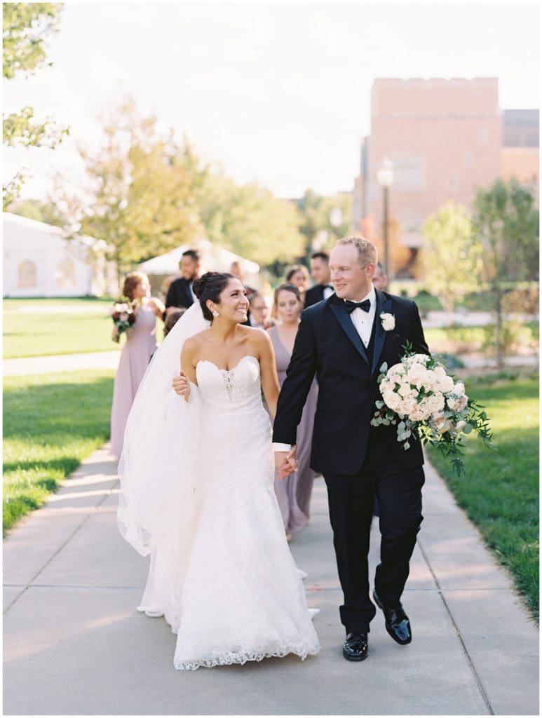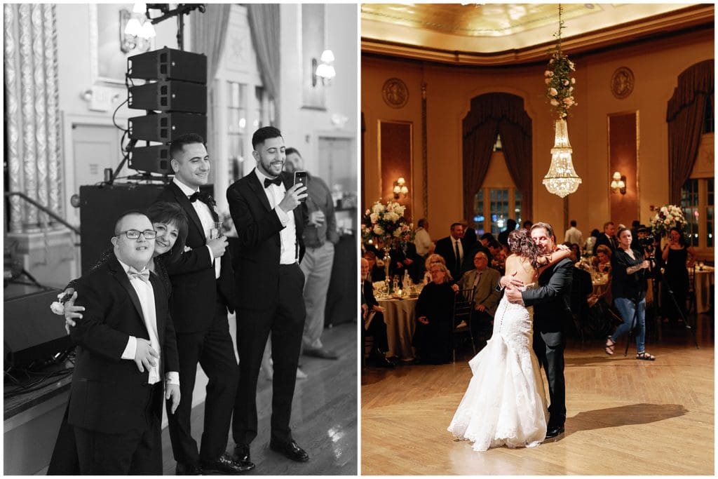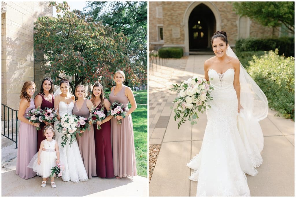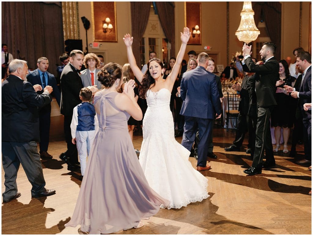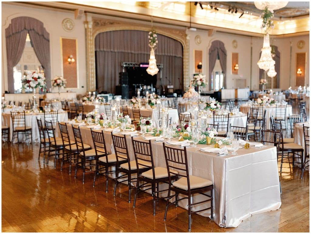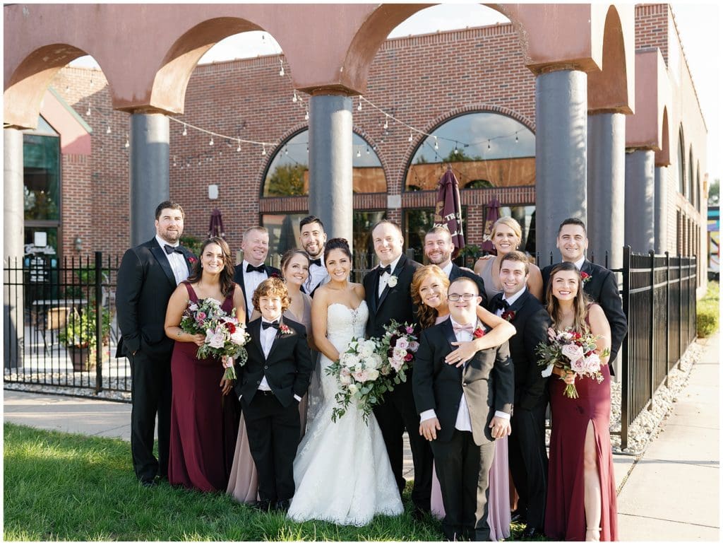 We then headed over to the campus of University of Notre Dame for some bridal party photos amongst the beautiful scenery of the campus! After some photo time there, we headed over to their family-owned restaurant, Macri’s Italian Bakery, to capture some fun shots at a place that holds a super special place in all of their hearts! Finally it was off to the majestic, Palais Royal in downtown South Bend, Indiana where the space was transformed by Poppies, AAYS and Events by ProShow with beautiful florals, rentals and additional hanging chandeliers to elevate the space. And what a celebration it held that night!