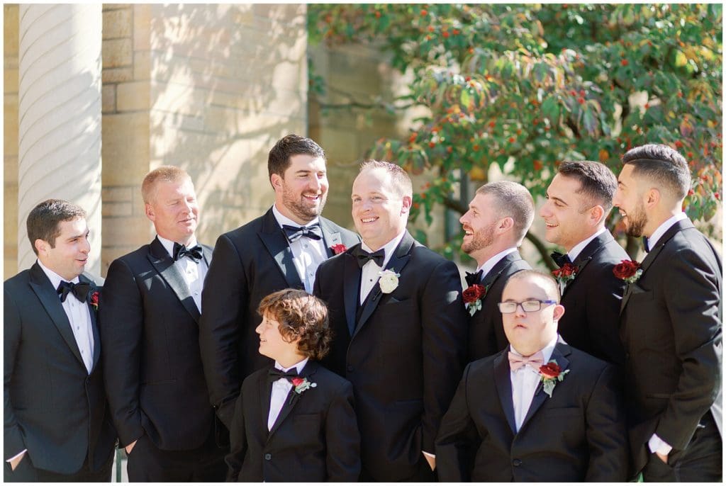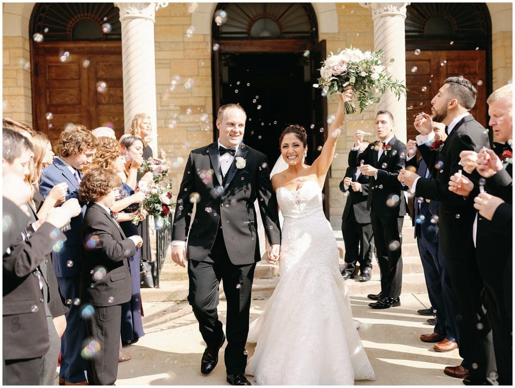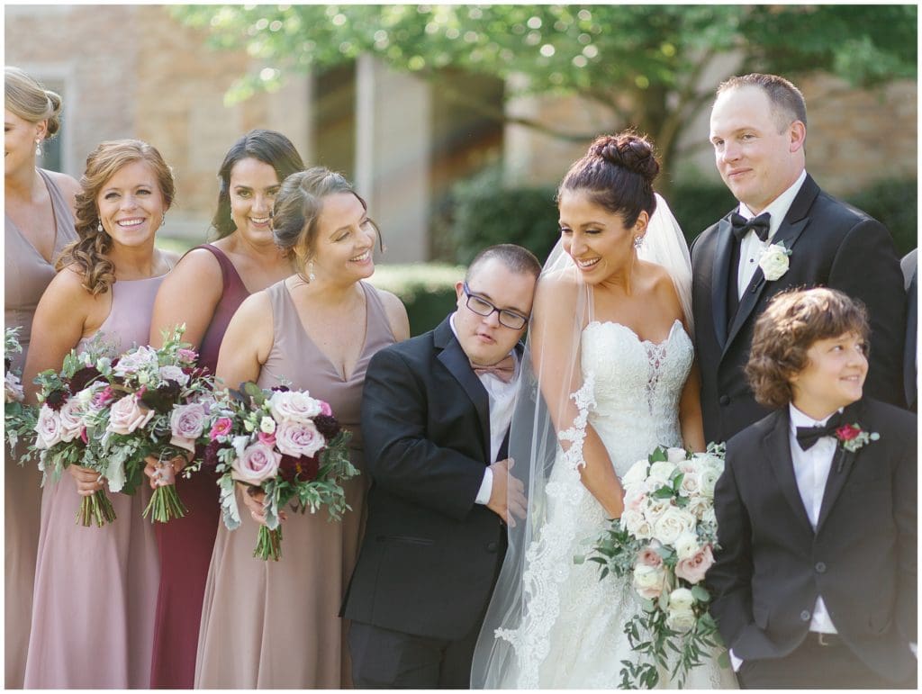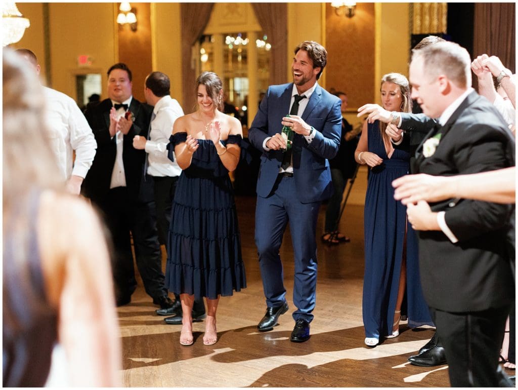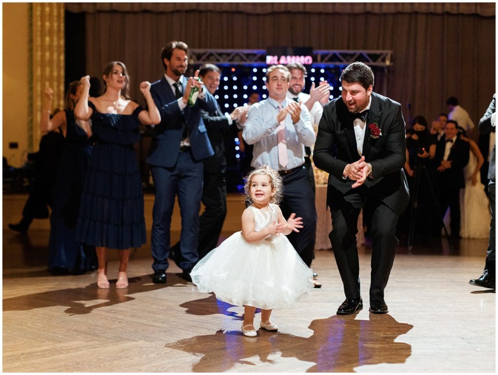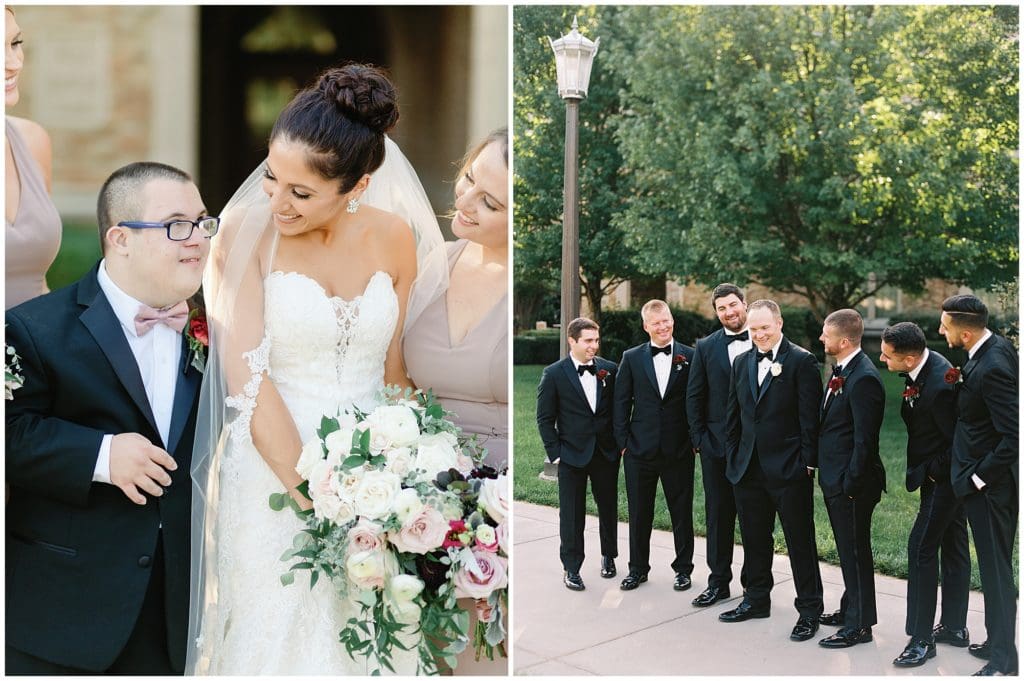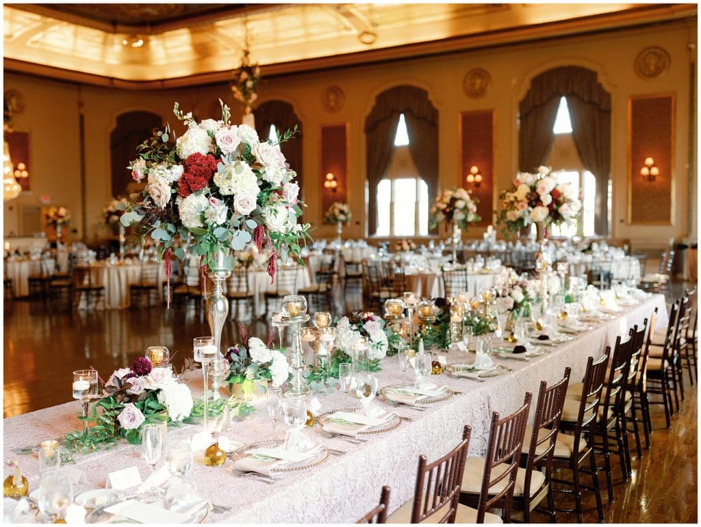 We then headed over to the campus of University of Notre Dame for some bridal party photos amongst the beautiful scenery of the campus! After some photo time there, we headed over to their family-owned restaurant, Macri’s Italian Bakery, to capture some fun shots at a place that holds a super special place in all of their hearts! Finally it was off to the majestic, Palais Royal in downtown South Bend, Indiana where the space was transformed by Poppies, AAYS and Events by ProShow with beautiful florals, rentals and additional hanging chandeliers to elevate the space. And what a celebration it held that night!