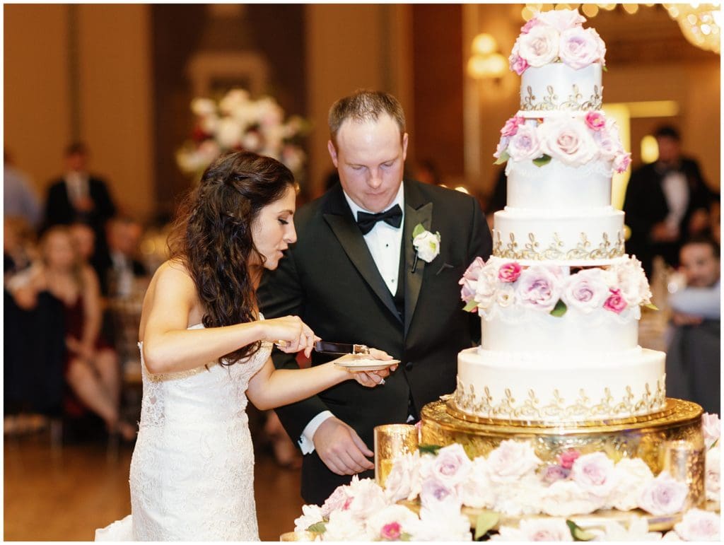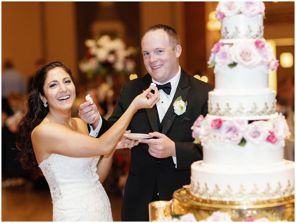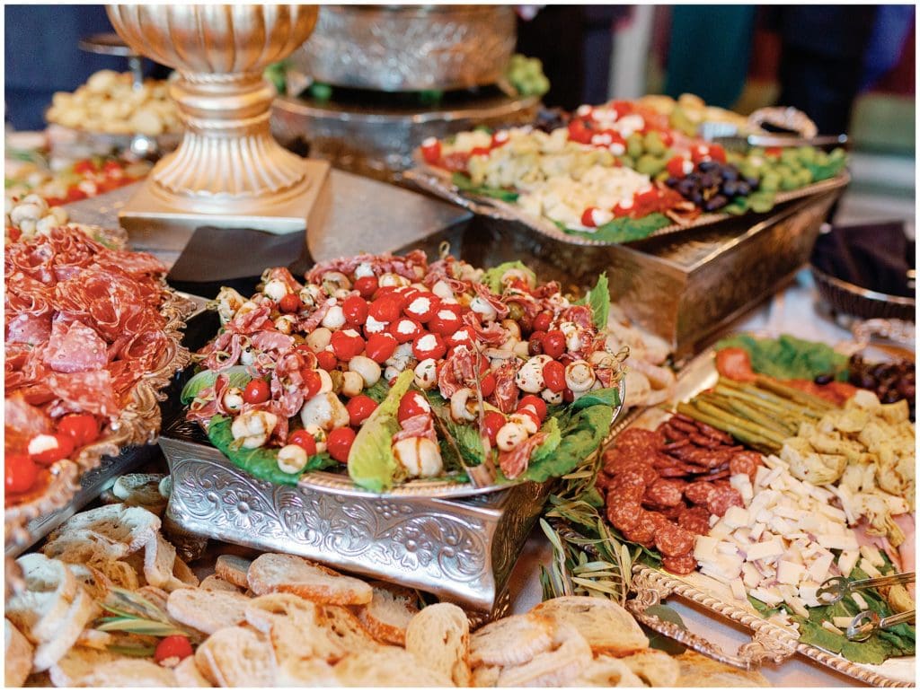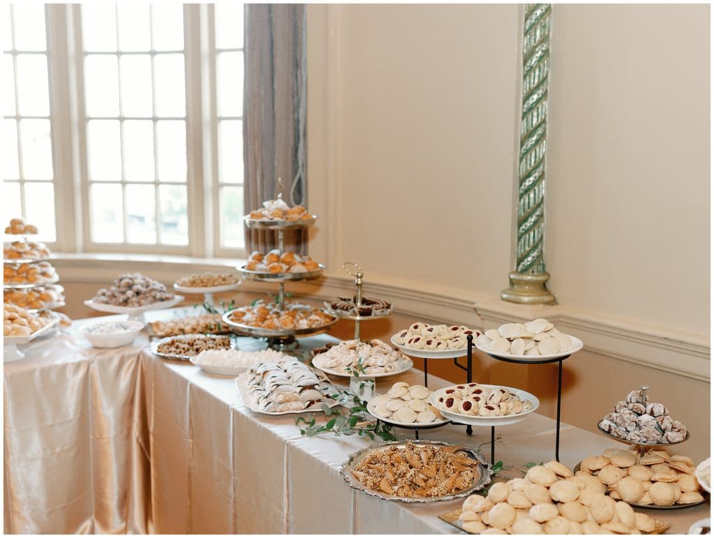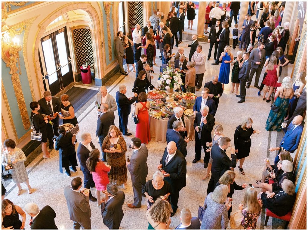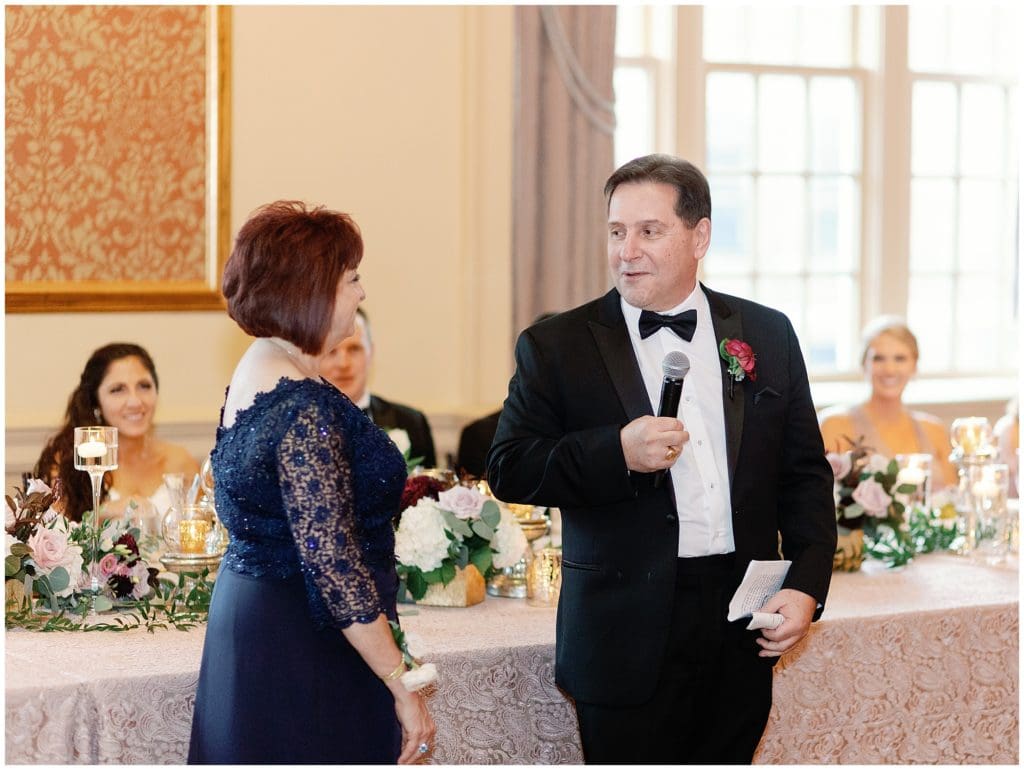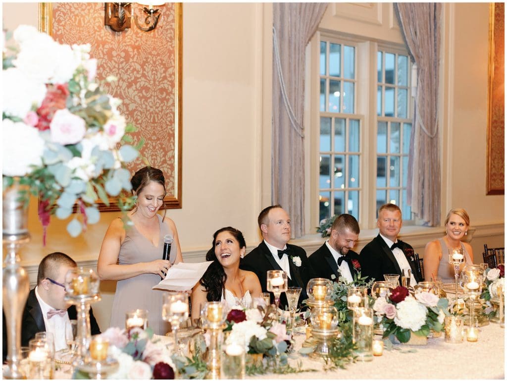 We then headed over to the campus of University of Notre Dame for some bridal party photos amongst the beautiful scenery of the campus! After some photo time there, we headed over to their family-owned restaurant, Macri’s Italian Bakery, to capture some fun shots at a place that holds a super special place in all of their hearts! Finally it was off to the majestic, Palais Royal in downtown South Bend, Indiana where the space was transformed by Poppies, AAYS and Events by ProShow with beautiful florals, rentals and additional hanging chandeliers to elevate the space. And what a celebration it held that night!