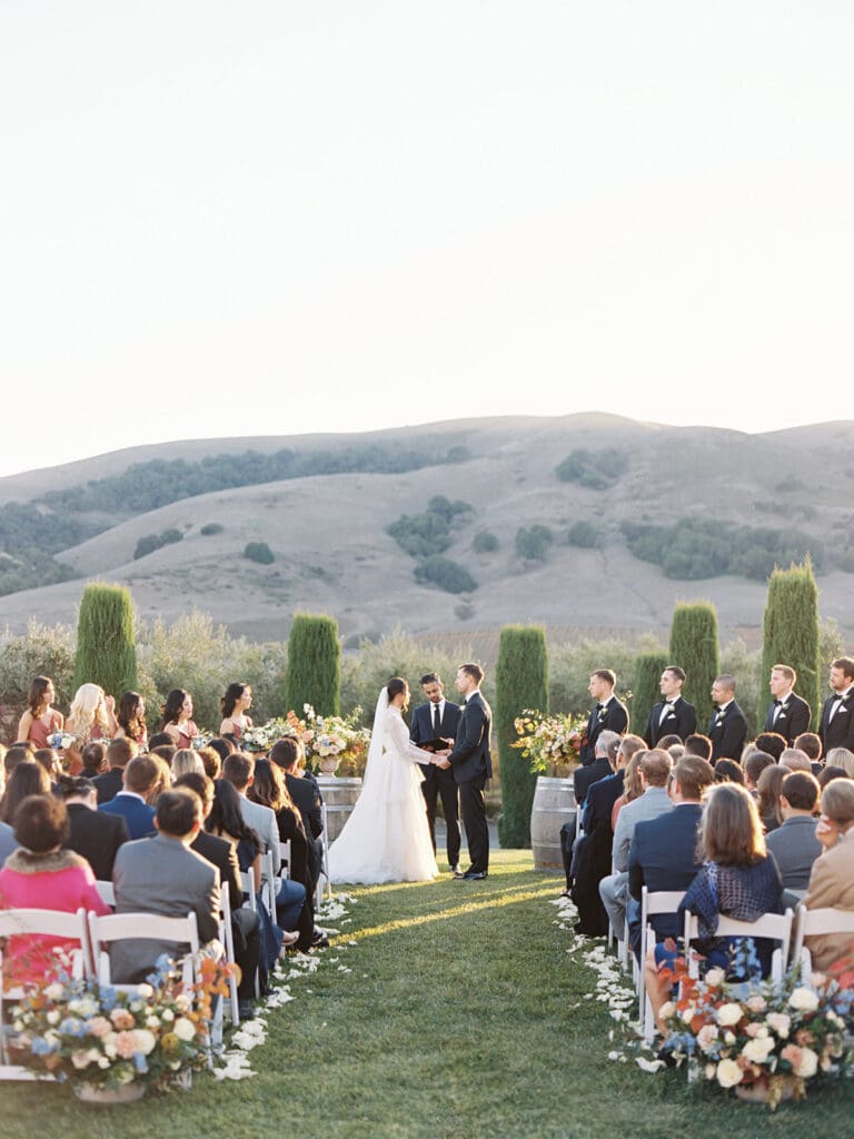 Becca and Jeff’s outdoor ceremony was gorgeous. The ceremony took place in the open lawn area of Viansa with the backdrop of rolling hills, cypress trees, and beautiful florals of soft creams, blush pinks, and autumn tones; the perfect color scheme for a fall wedding.