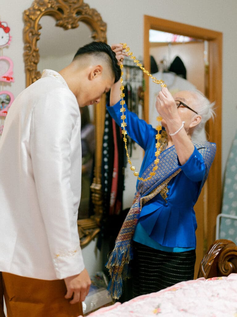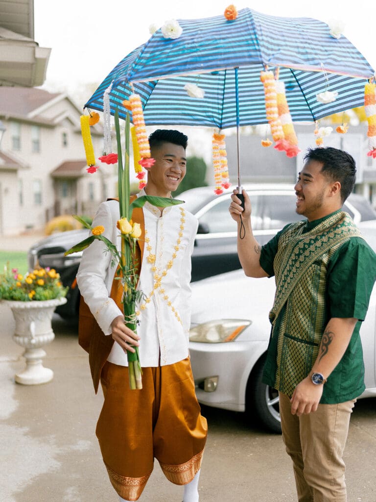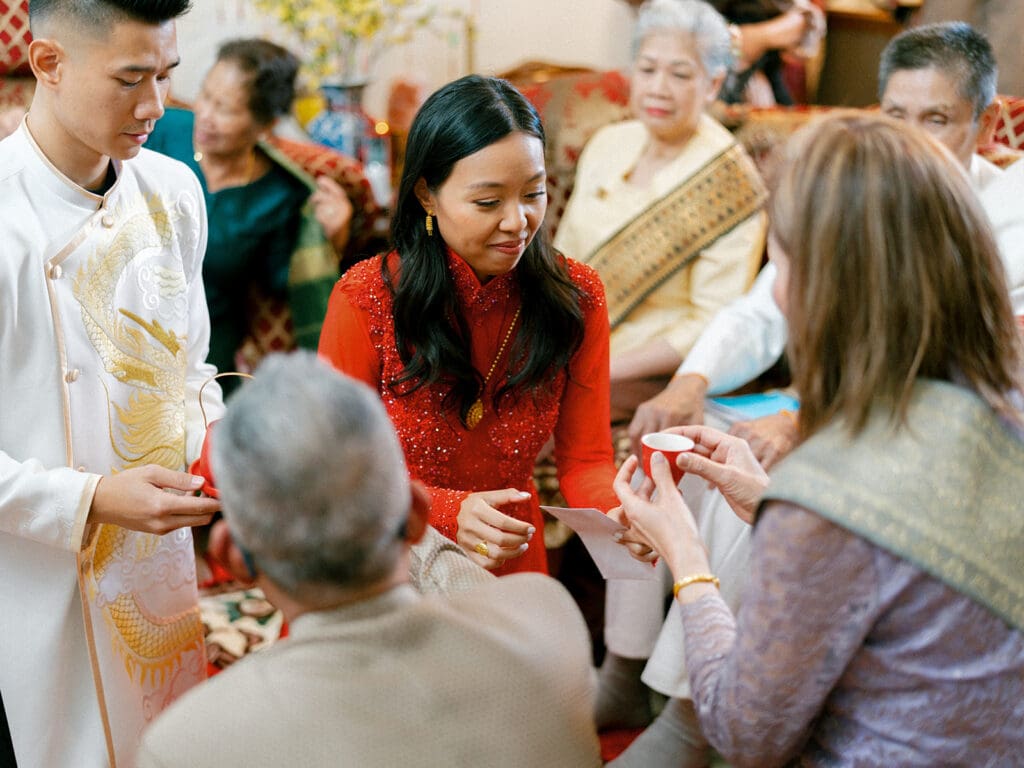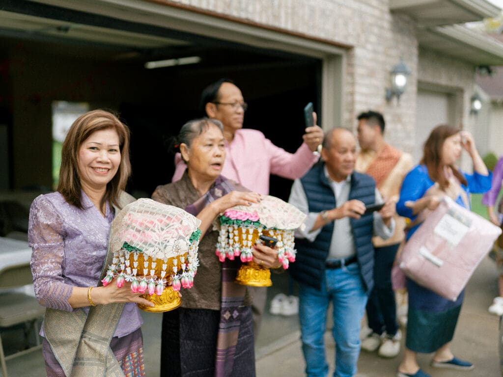 Sophie and Tommy’s at-home Lao and Vietnamese wedding ceremony in Indiana was beautiful. It was obvious that they and their family put a lot of time and effort into bringing everything together. There were tons of cultural details and traditions done during this ceremony, such as their prayer at the altar, the tea service and candle lighting ceremony, and honoring their elders by involving them in the entire ceremony.
