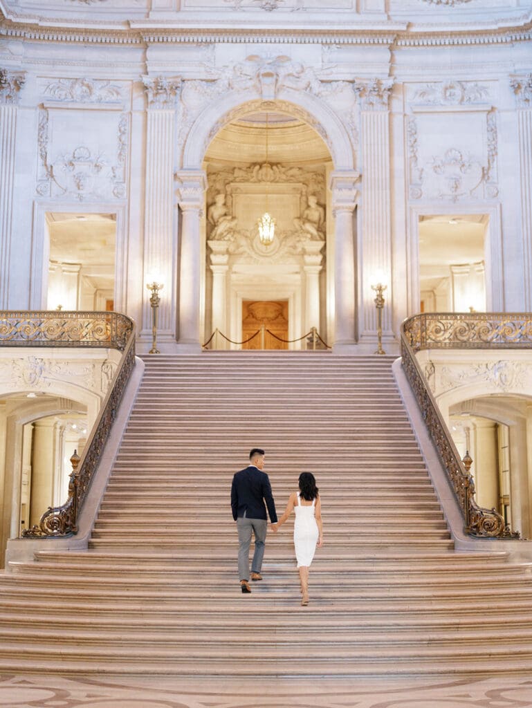 We started off inside San Francisco City Hall. This location is incredibly popular for engagements, elopements, and weddings because it’s absolutely gorgeous. With it’s grand marble staircase and intricate details, this location exudes elegance and romance—perfect for a San Francisco engagement session.