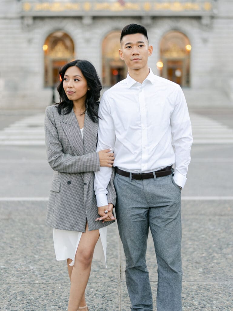 After their engagement photos inside SF City Hall, we stepped outside for a few more shots. Sophie added a cute jacket, and they both put on sunglasses, which added to their looks! Overall, I had such a great time capturing Sophie and Tommy’s engagement photos in San Francisco, followed by their beautiful wedding weekend in Indiana!