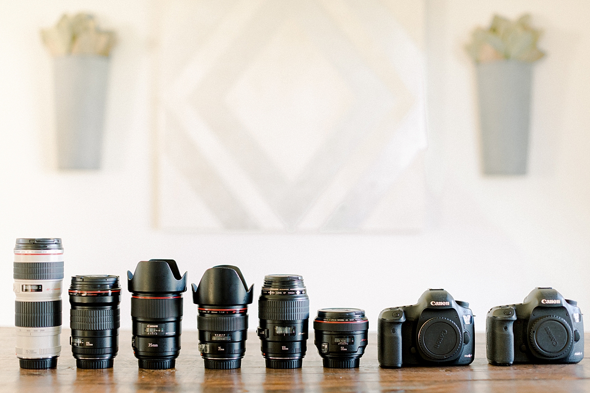 Pictured above is the entirety of my bodies and lenses that I have with me on a wedding day. Just two years ago though I only had half of these and did just fine! Before expanding my collection to fit different needs, all I had was the 35mm, 50mm, 135mm and one Canon 5D Mark III. Aside from flashes, batteries and camera straps that we’ll talk about soon, those really served the purpose of all I needed for a wedding day! And for 6 years of business none-the-less! One common misconception that I hear a lot from photographers is that they have to get better equipment to be a better photographer and I just don’t think that’s true at all… which should be SUCH a relief because this stuff is EXPENSIVE! Get the main items you need to do a good job and then focus on educating yourself on how to use those well. Then and only then would I recommend continuing to invest in more lenses and bodies.