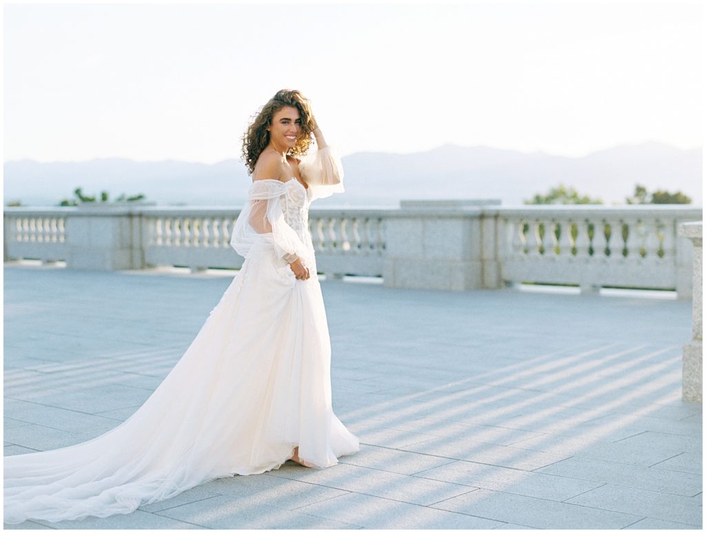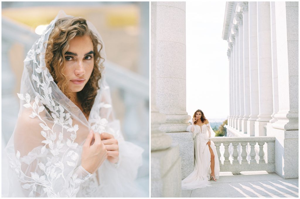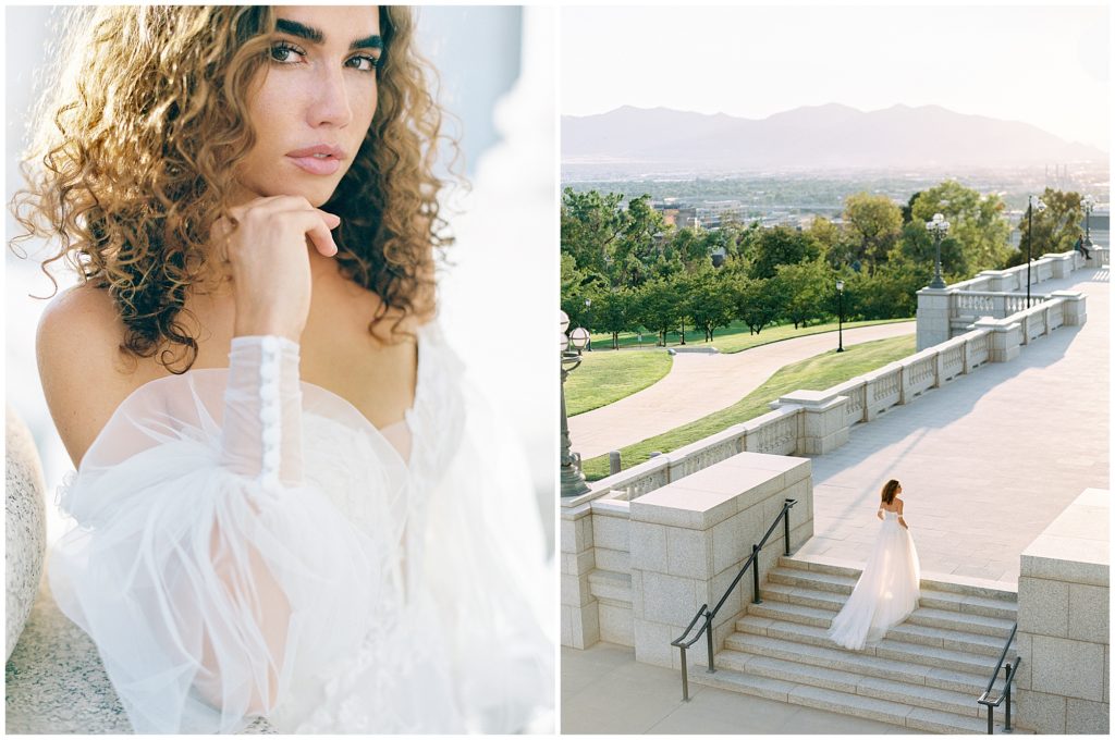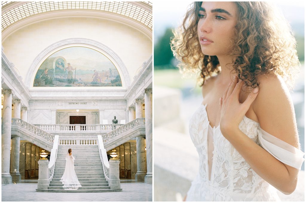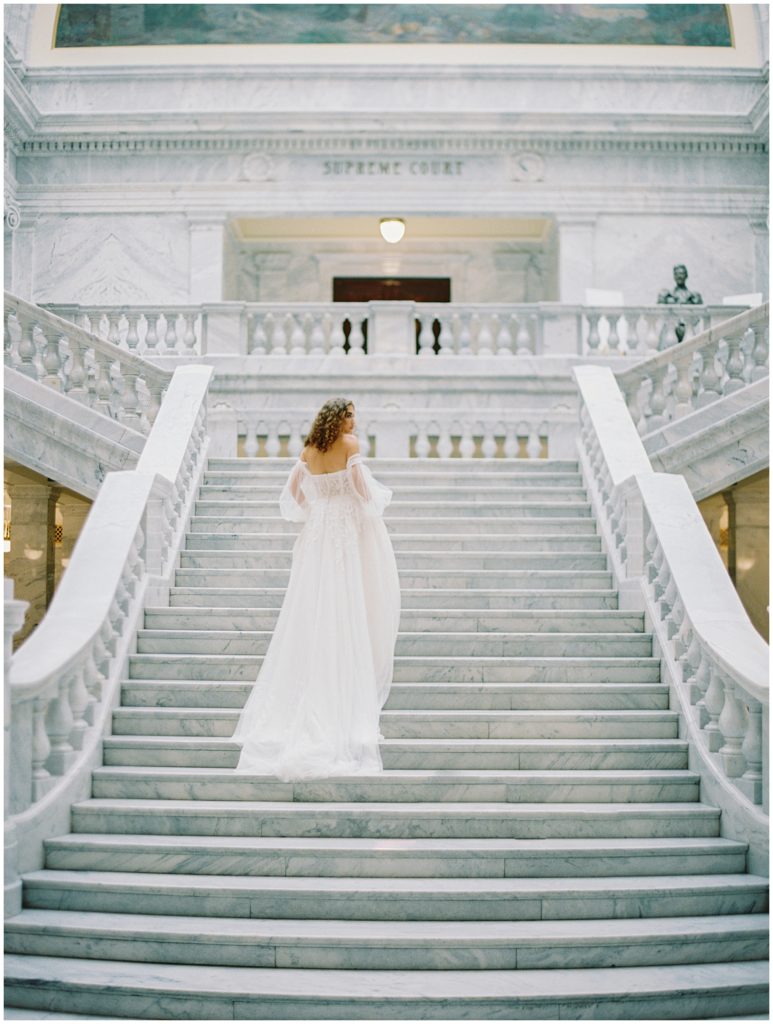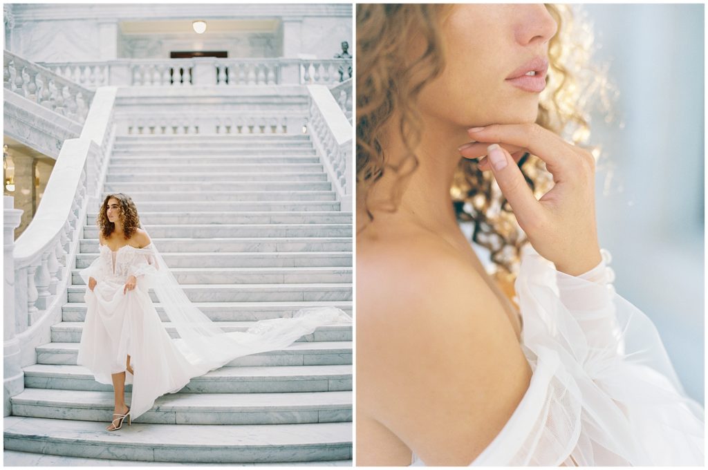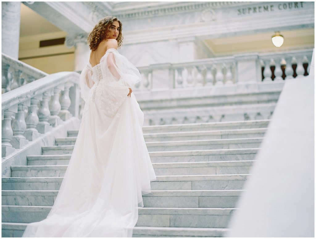 When we were in Salt Flats for The Hybrid Co. last September, we asked Paityn if she’d want to meet us at the Utah State Capital Building for an impromptu editorial shoot. When she let us know she was in, we contacted The Bridal Studio who said they would collaborate with us. The marble details of the grand staircase and artwork surrounding the space made for such a fun shoot.